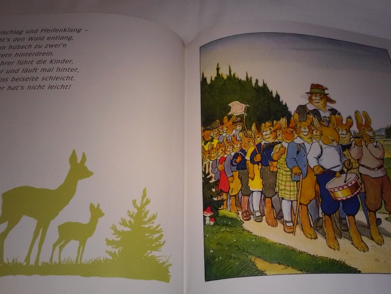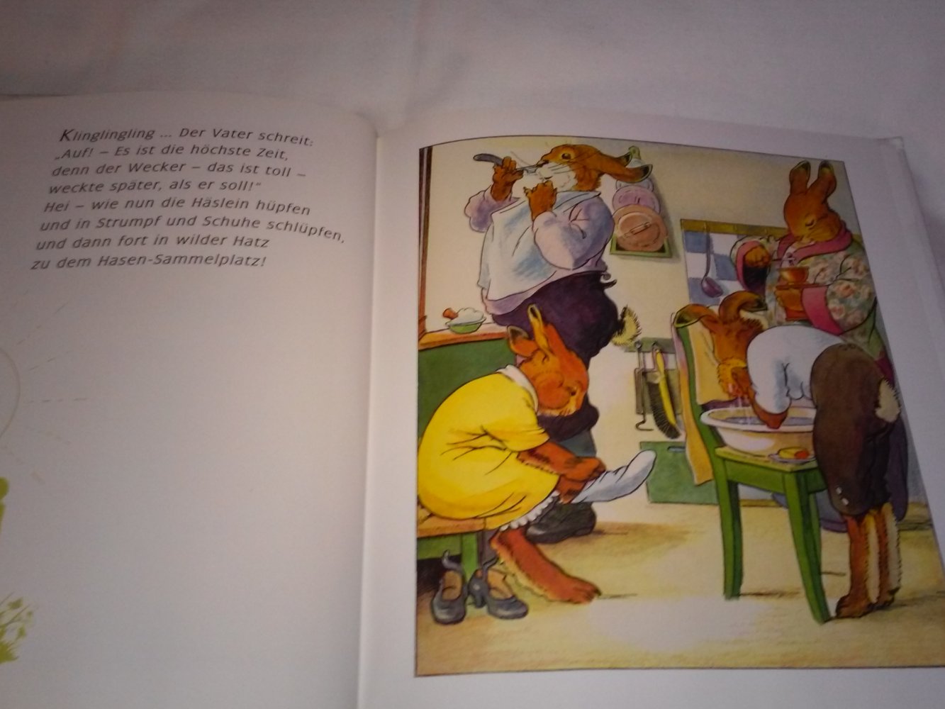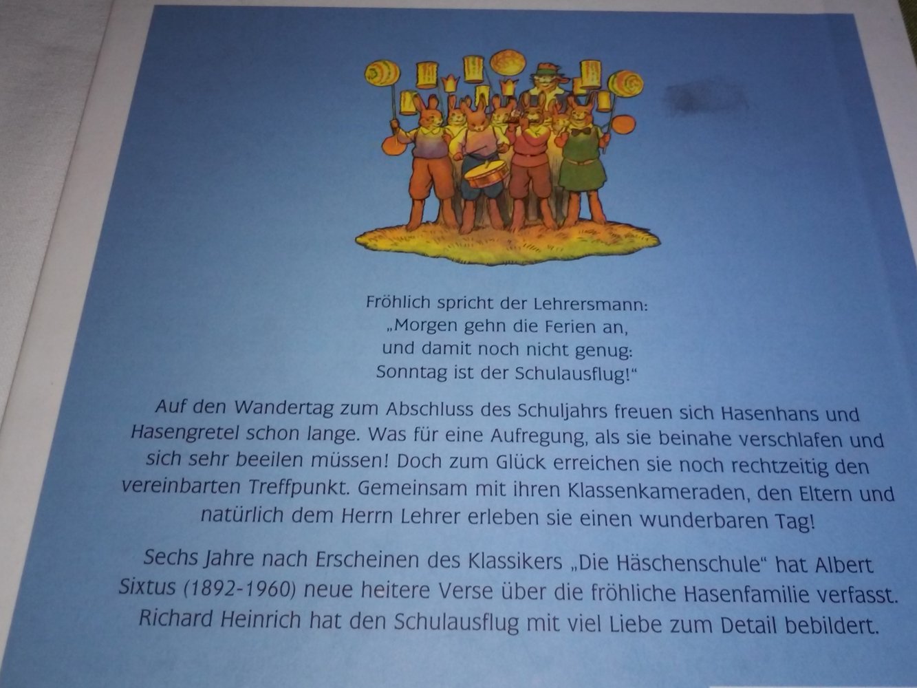 Der Häschen-Schulausflug: (wie neu) Auf dem Wandertag zum Abschluss des Schuljahrs freuen sich Hasenhans und Hasengretel schon lange. Was für eine Aufregung, als sie beinahe verschlafen und sich sehr beeilen müssen! Doch zum Glück erreichen sie noch rechtzeitig den vereinbarten Treffpunkt. Gemeinsam mit ihren Klassenkameraden, den Eltern und natürlich dem Herrn Lehrer erleben sie einen wunderbaren Tag!