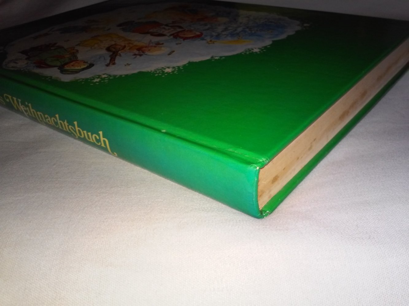 äußerlich etwas angestoßene Ecken und oberer Buchschnitt leichte Stockflecken (macht ein wenig den Scharm dieses alten und wunderschönen Buches mit aus)