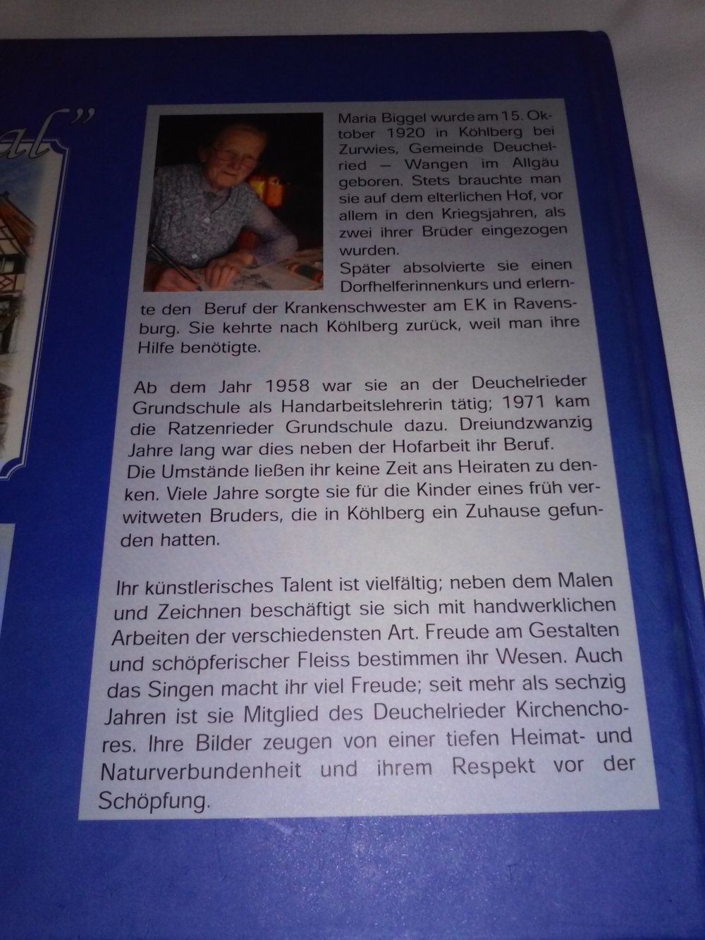 Es ist eine Bildgeschichte die auf bunten prächtigen Bildern (alle von Maria Biggel geschaffen) und mit den dazu passenden Texten versehen, die Arbeit und das bäuerliche Leben im Allgäu zeigt. Hervorragend gelang es der Schriftstellerin in anschaulicher Weise, wie es war in Wald und Flur von Herbst bis Winter. Ihr erstes Büchlein 'Frühjahr und Sommer' ist bereits 1999 entstanden. 'Ich habe schon als Kind gerne gemalt, doch im späteren Berufsleben fehlte mir dann dazu die Zeit', erzählt sie. Erst im sogenannten Ruhestand konnte sie ihrem Hobby, der Malerei, mehr frönen. Ihre Bilder habe sie meist Verwandten zum Geschenk gemacht. 'Die haben mich animiert meine Bilder in einem Büchlein zusammenzufassen', so Biggel.