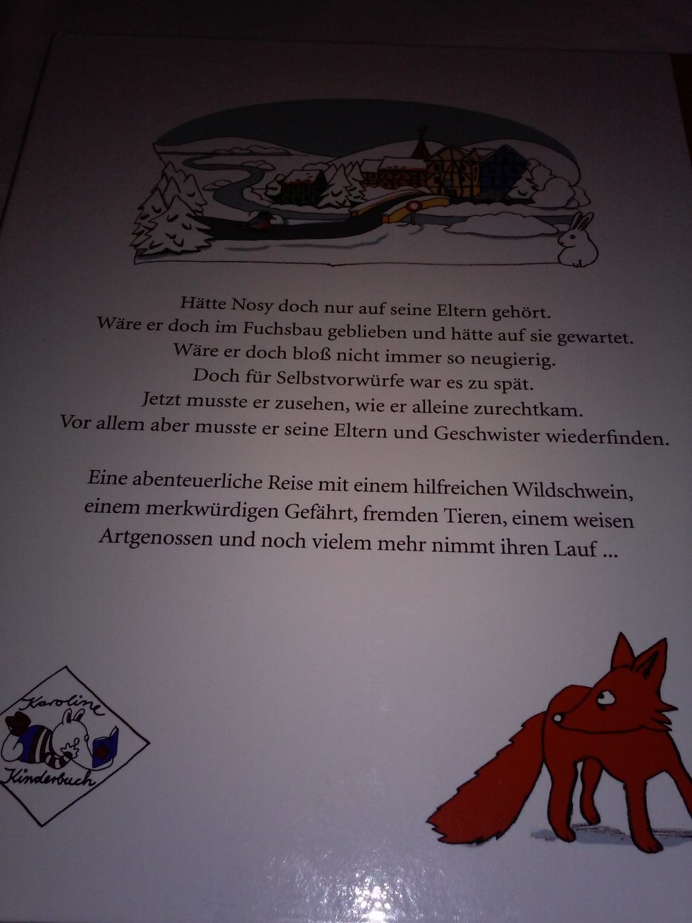 Hätte Nosy doch nur auf seine Eltern gehört. Wäre er doch im Fuchsbau geblieben und hätte auf sie gewartet. Wäre er doch bloß nicht immer so neugierieg. Doch für Selbstvorwürfe war es zu spät. Jetzt musste er zusehen, wie er alleine zurechtkam. Vor allem aber musste er seine Eltern und Geschwister wiederfinden. Eine abenteuerliche Reise mit einem hilfreichen Wildschwein, einem merkwürdigen Gefährt, fremden Tieren, einem weisen Artgenossen und noch vielem mehr nimmt ihren Lauf.... "Nosy" ist eine spannende Fuchsgeschichte, aufwendig und lustig illustriert, zum Vorlesen und Selberlesen ab 5 Jahren.