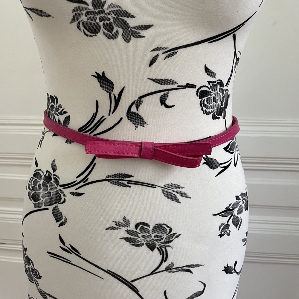 Pinker Gürtel als knalliges Accessoire. Er misst ab der Schleife etwa 107 cm, ab dem 1. Knopf 105. An zwei Stellen sind kleine Abnutzungsspuren zu sehen, siehe Bilder.
