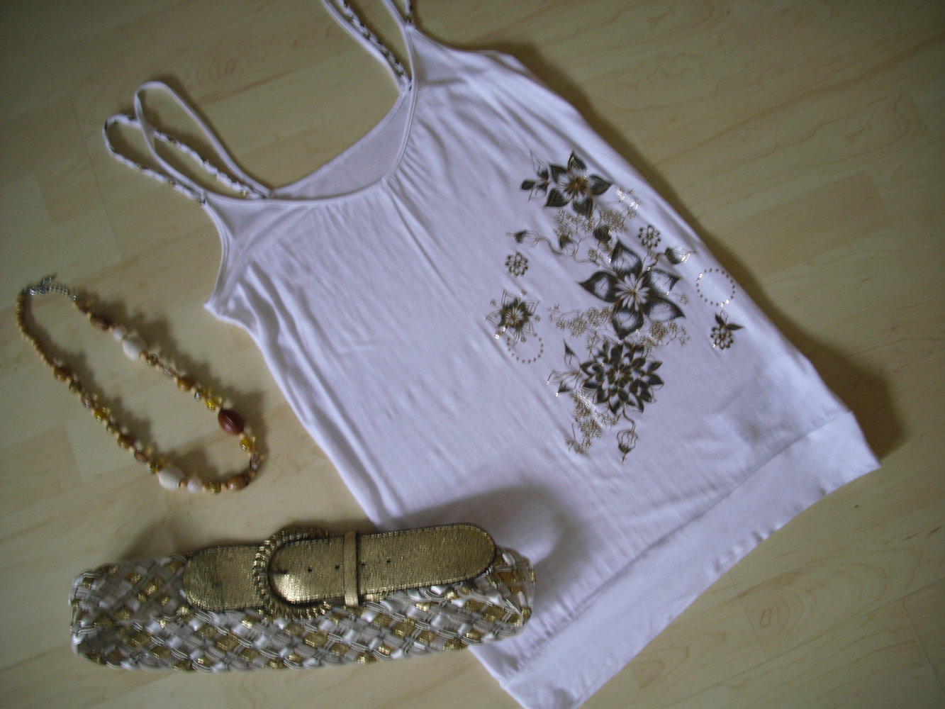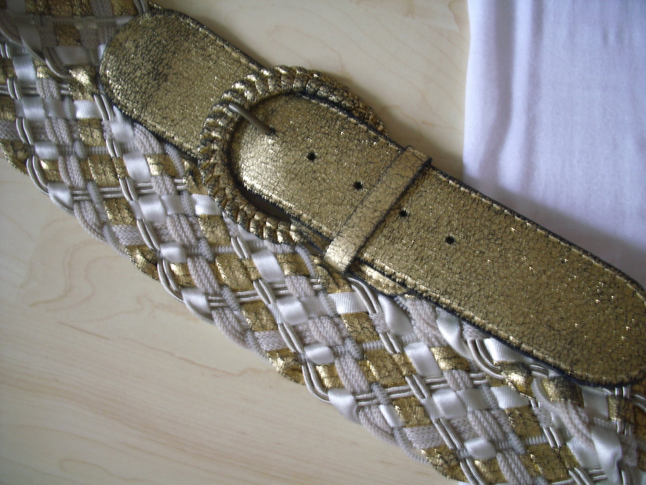 Schicker breiter Flechtgürtel in Metallic-Optik: Weiss-Goldfarben. Ca. 104 cm lang, Verschlussweite 88-98 cm. Das Gold hat Vintage-Optik und ist in gewollt abgeblätterter Form. Versandkosten kommen hinzu und trägt der Käufer.