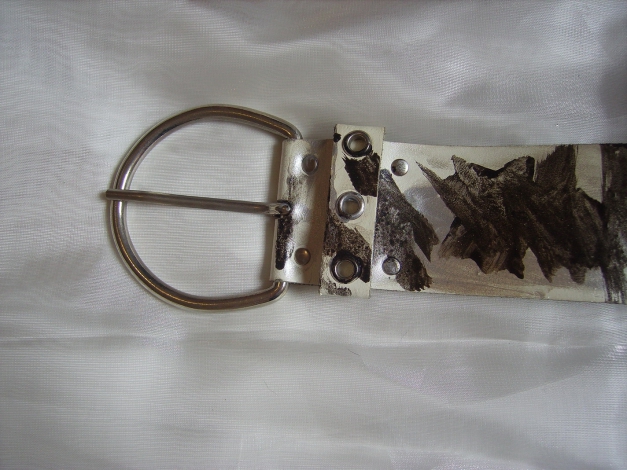 Breitgürtel mit großer Rundschnalle - 80er Chic! Dieser topmoderne Gürtel ist in weiß gehalten, aber in Handarbeit mit einem silber-schwarzen Abstraktmuster aufgehübscht worden.