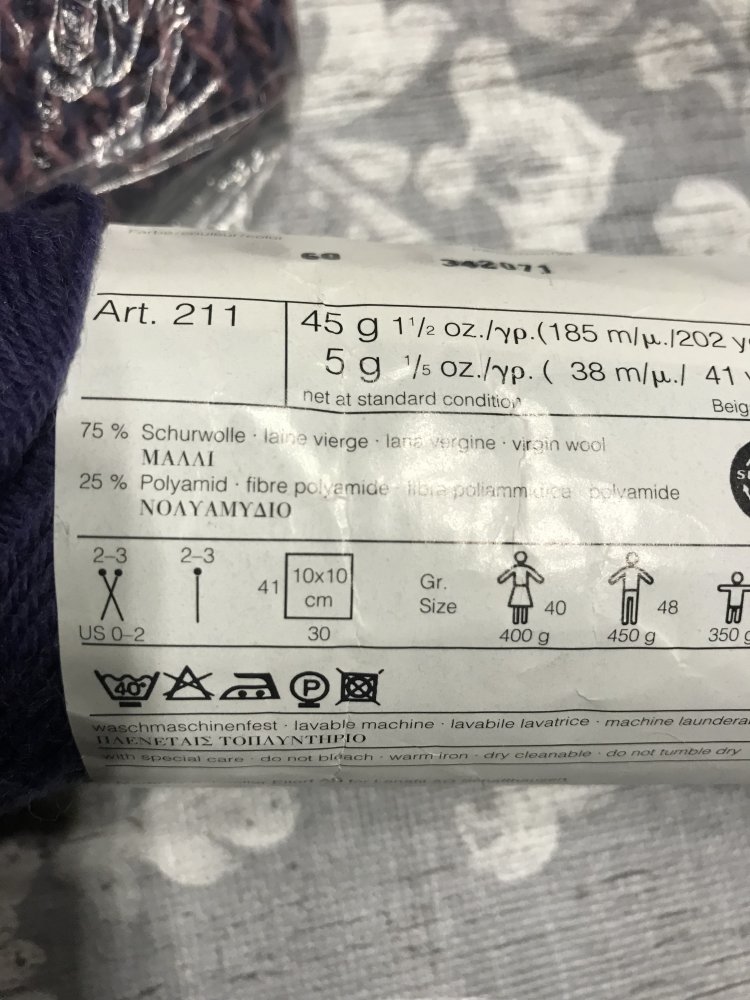 Es sind 2 Wollefäden verarbeitet. Altrosé und Petrol/Flieder. Beide zu je 75% Schurwollanteil und 25% Polyamid. Bei Schonwäsche waschbar. Markenware Schaffhauser.