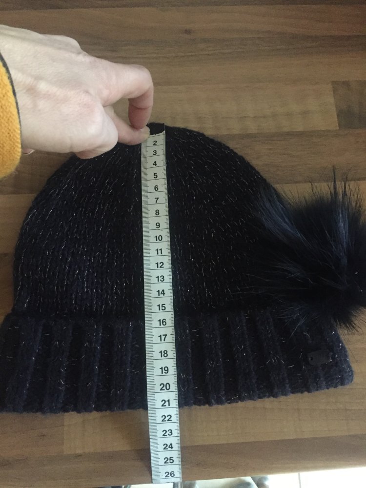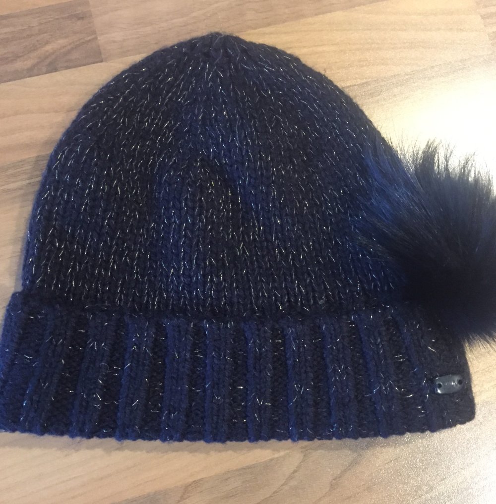 River WoodsRiver Woods Wollmütze mit verstellbarem Bommel Dunkelblau mit Silberfäden meliert, der Bommel ist mit Satinbändern seitlich angebracht, kann somit auch am Hinterkopf angebracht werden oder abgemacht werden