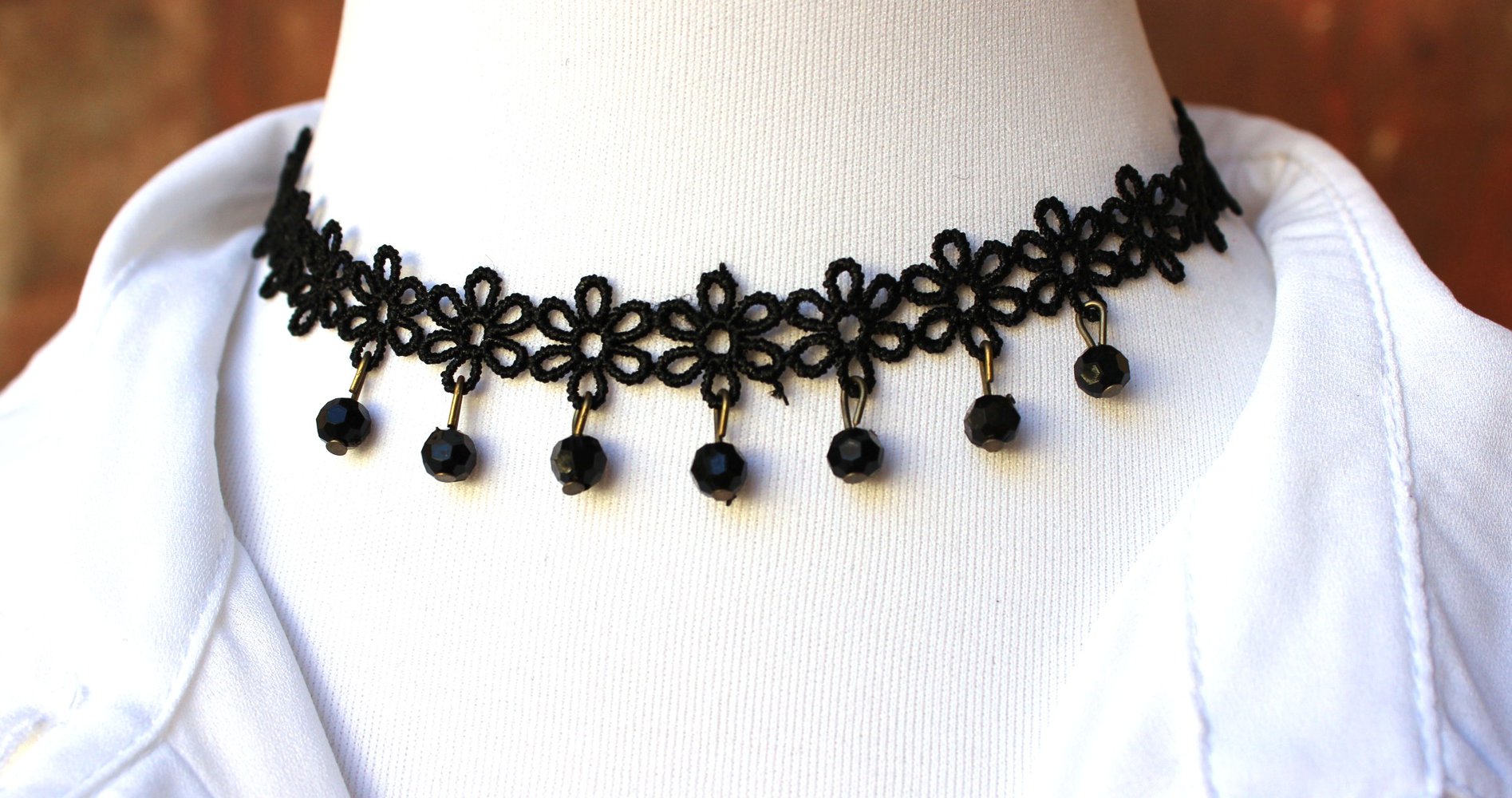 Die Kette besteht aus schwarzen, filigranen, gestickt wirkenden Blumen.