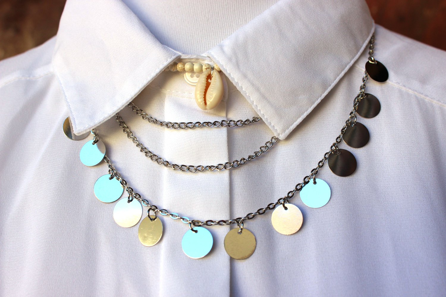 Sie besteht aus mehreren Reihen in silber und cremefarbenen Perlen mit 3 Muscheln. Die längere silberne Kette hat auch silberne Plättchen als Anhänger.
