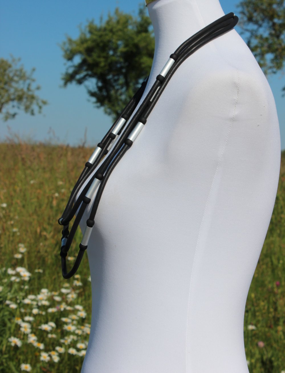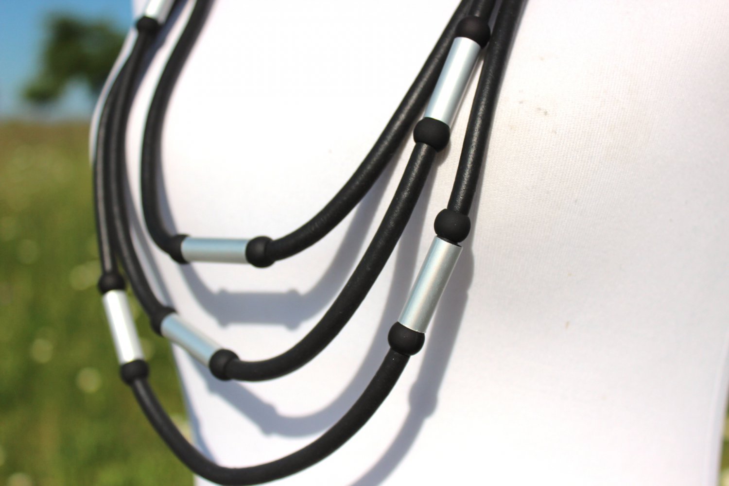 Kette, Halskette, Kautschuk, Kautschukband, Gummiband, Metallelemente, minimalistisch, edgy, Lagenlook