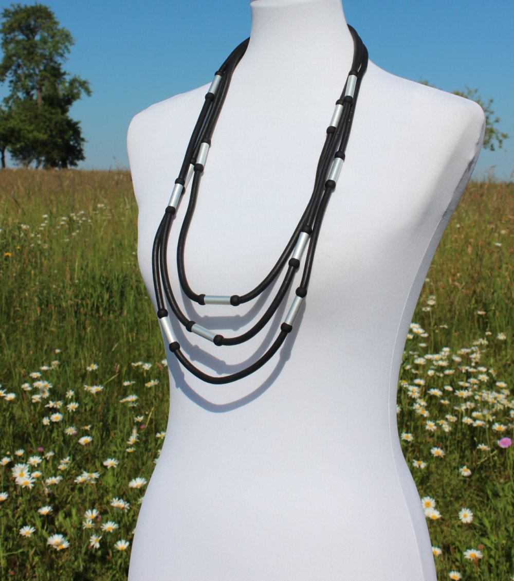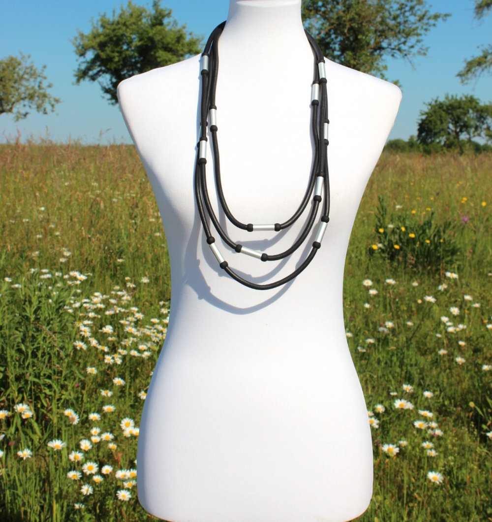 neue dreireihige schwarze Kette aus Kautschukband mit silbernen „Metall“ Elementen