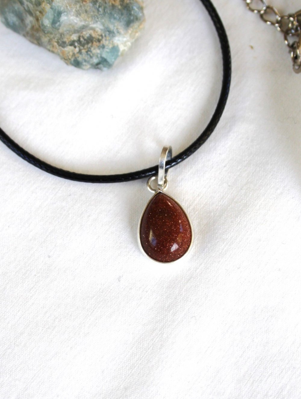 Schwarze, längenverstellbare Kette mit zierlichem Anhänger mit echtem, tropfenförmigen Goldflussstein.