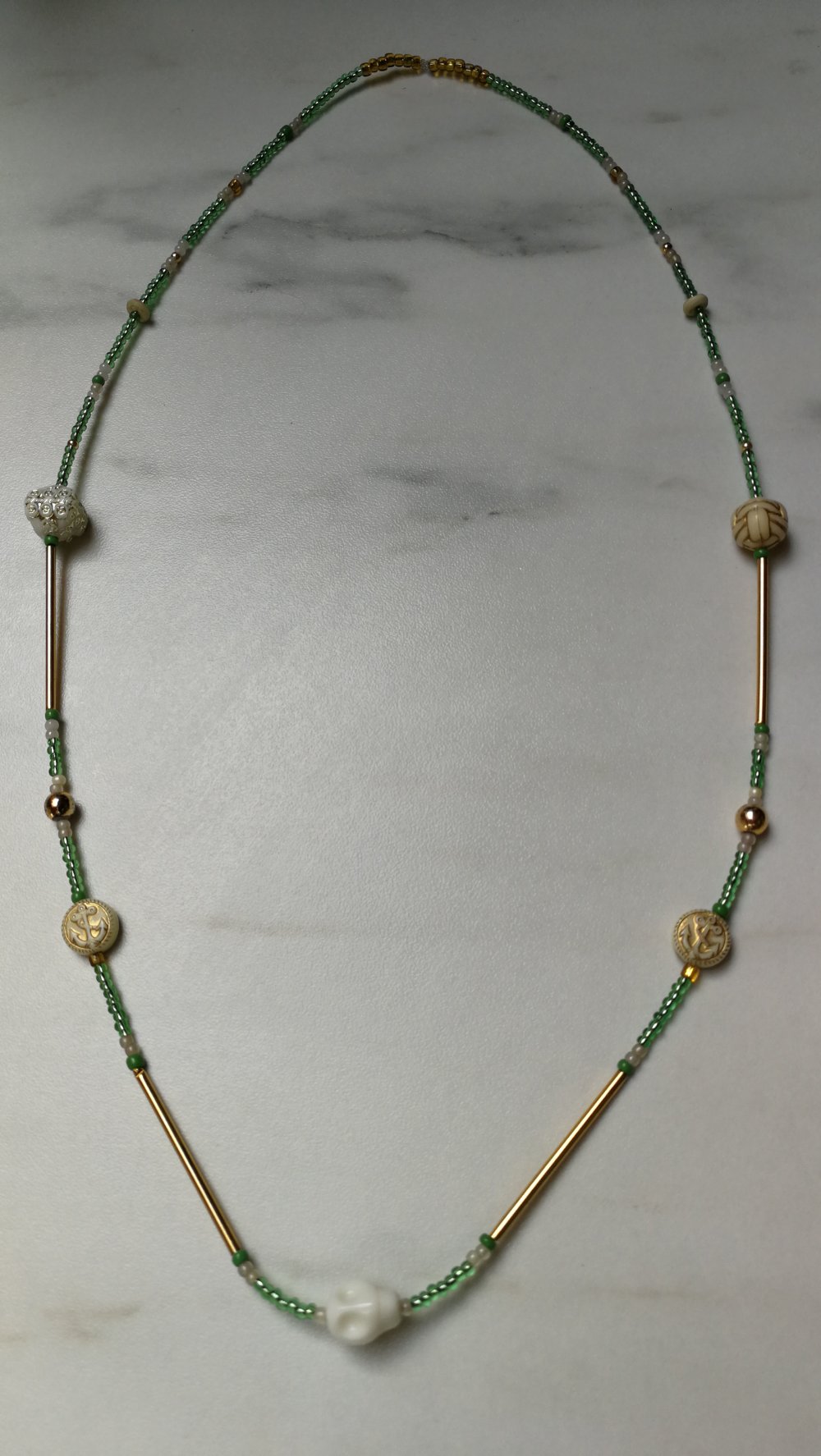 Eine einmalige tolle Halskette mit witzigen rockigen Details - einem kultigen Totenkopf sowie gold-cremefarbenen Miniankern. Dazwischen goldigen und grüne Perlen & Stabperlen, die teils sogar noch aus den 90ern stammen.