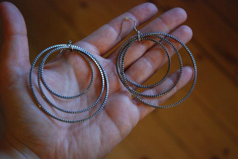 Große silberfarbene Ohrringe (Creolen würden die nur heissen, wenn das runde durchs Ohr geht oder? Ich nenne sie trotzdem mal so, sieht ja so ähnlich aus :P)