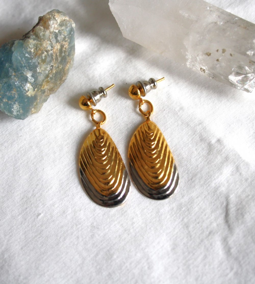 Ungewöhnliche, gold- und silberfarbene Ohrringe (Stecker) im gewelltem Muster.