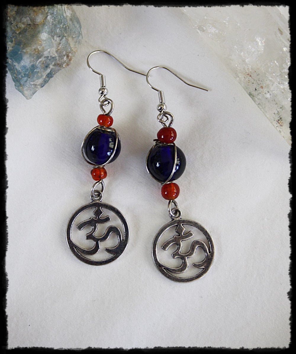 Zauberhafte, silberfarbene Ohrringe mit jeweils einem wunderschönen OM-Anhänger, sowie jeweils einer dunkelblauen, eingefassten Glasperle und kleinen roten Glasperlen.