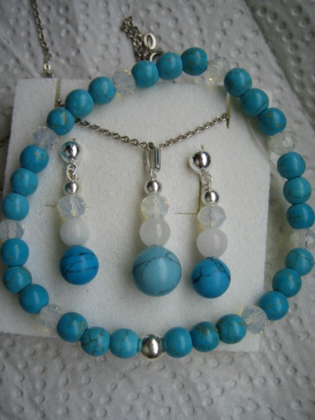 Ca. 3cml ange Ohrringe / Stecker aus 925er Silber einer ca. 8mm dicken Türkis-Kugel , facettiertem Glas und einer ca. 6mm dicken weissen Morganit Perle.