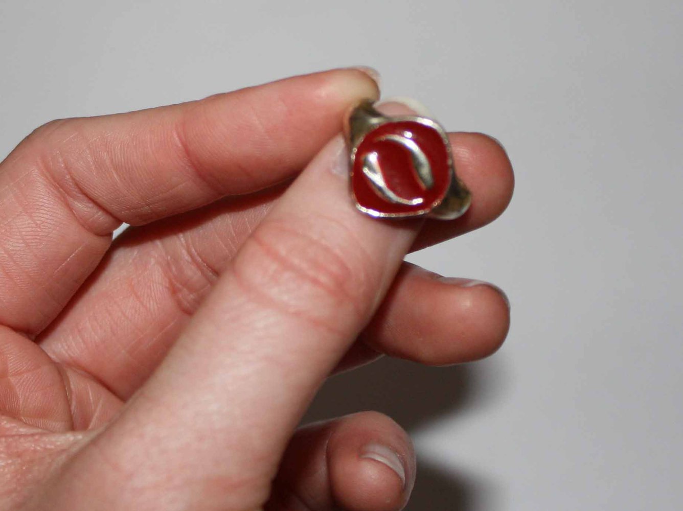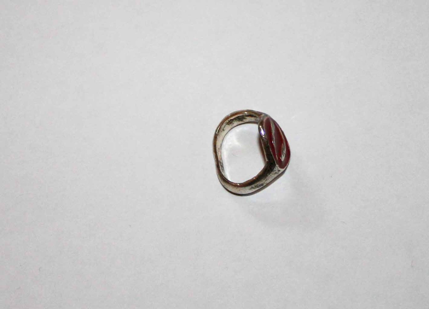 Silberner Ring mit roter Fläche, aus der sich ein silbernes Symbol erhebt.