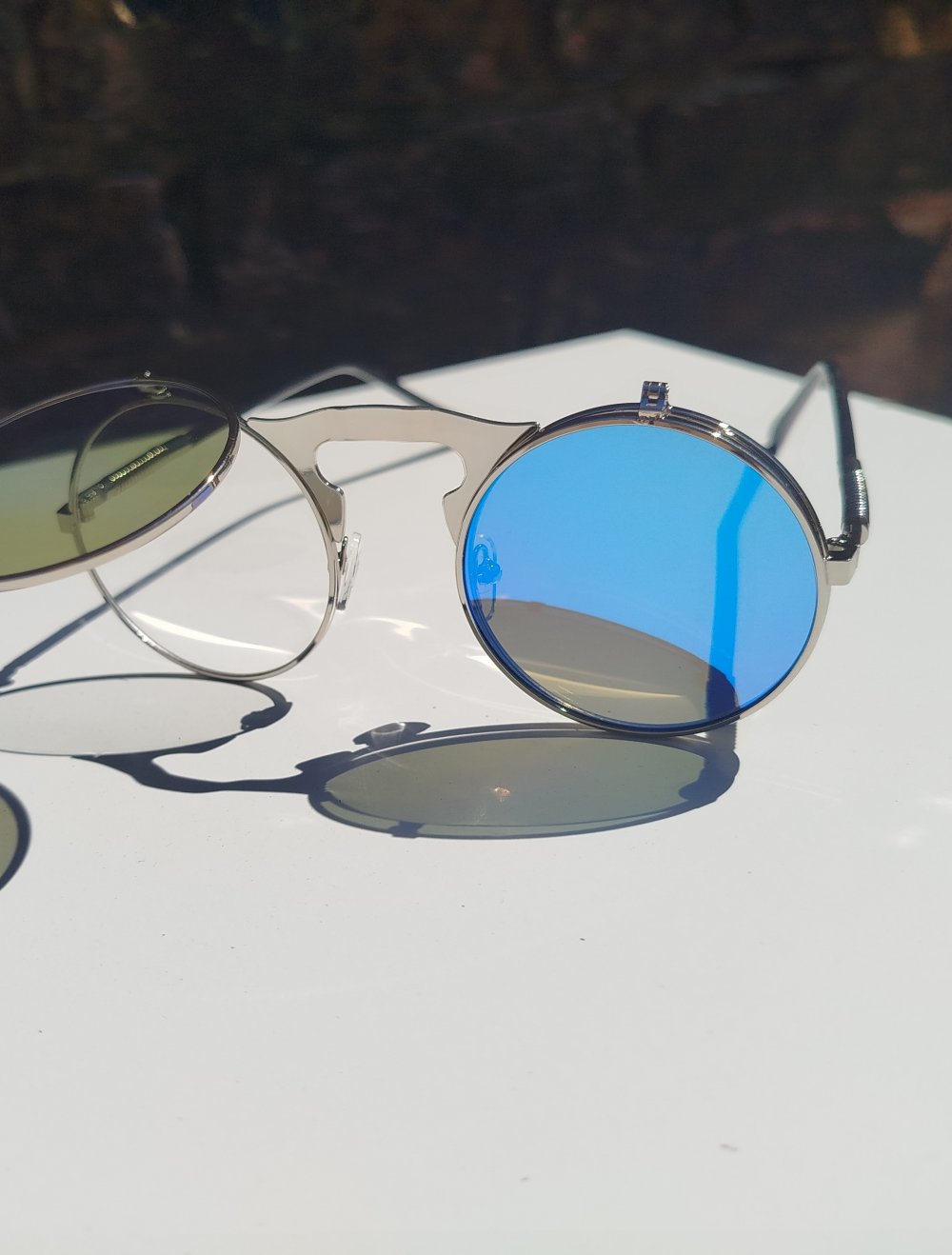 silberne vintage Sonnenbrille mit klappbaren Gläsern (blau verspiegelt) und flexiblen Bügeln. unisex für Männer und Frauen.neu