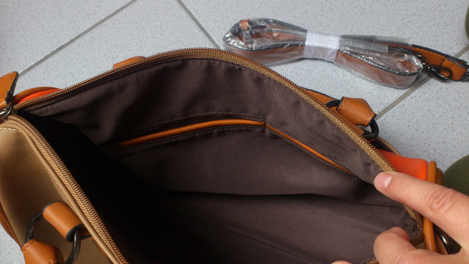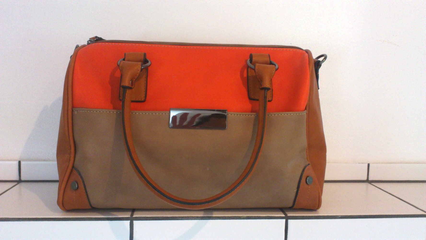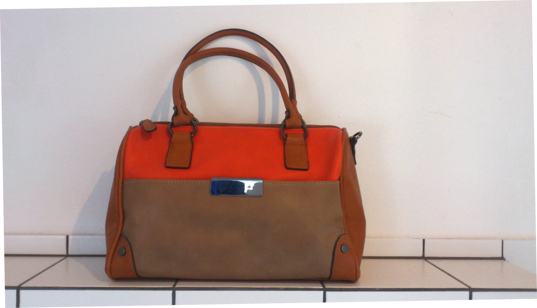 Schöne Handtasche in den Farben orange, braun und beige. Sie stand nach dem Kauf nur im Schrank und ist daher vollkommen unbenutzt. Außen besitzt sie auf der Vorderseite ein Fach mit Magnetknopf, auf der Rückseite ein Fach mit Reißverschluss. Innen hat sie zusätzlich ein Fach mit Reißverschluss und 2 Fächer für Handy usw. ohne Verschluss. Die Ringe für den Trageriemen an der Seite der Tasche und der Magnetverschluss außen sind anthrazitfarben/silber-grau. Der Trageriemen ist noch verpackt und wird natürlich mitgeschickt. Dieser ist längenverstellbar (wie bei einem Gürtel).