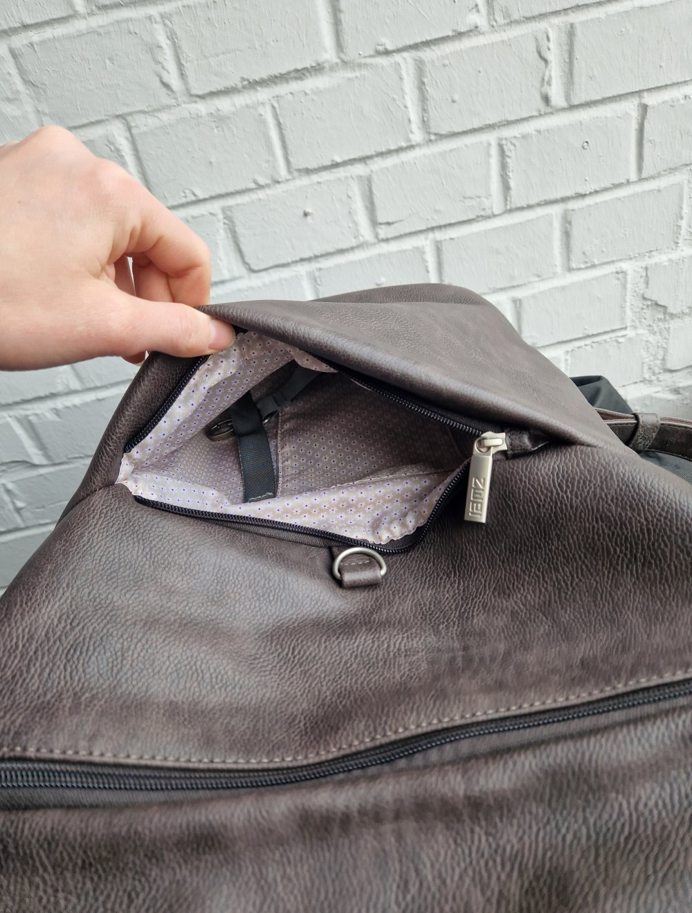 - Auf der Vorderseite ein Reißverschlussfach mit einem Karabinerhaken innen für bspw. Schlüssel (siehe Foto 7).