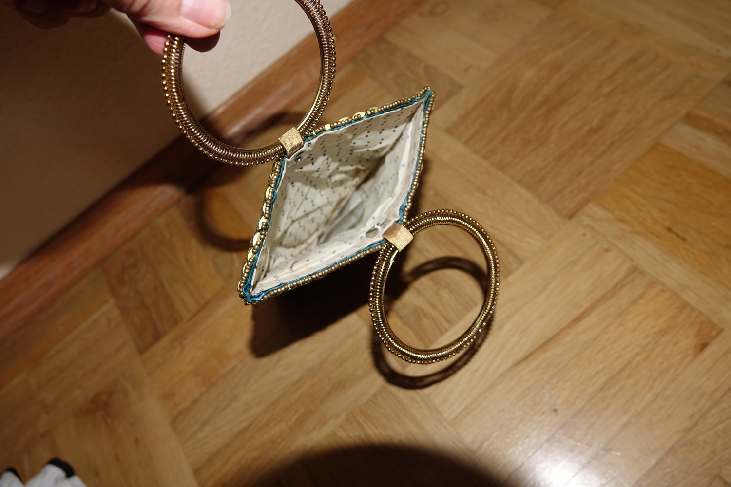 Süßes Handgelenks-Täschchen aus Indien, es ist NEU, allerdings sind ein paar Perlen auf einer Seite weg, da sich eine Nylonschnür gelöst hat, habe dort nun einen Knoten gemacht und es geklebt, siehe Bilder, die andere Seite ist in Ordnung. Ansonsten Top...