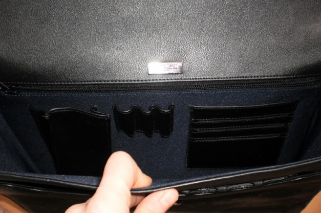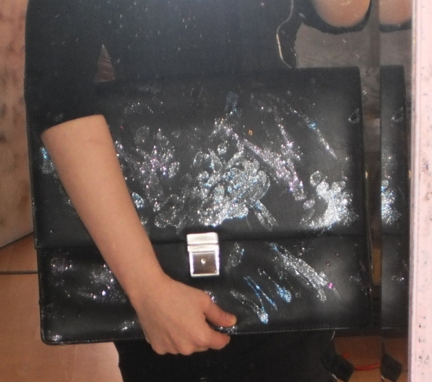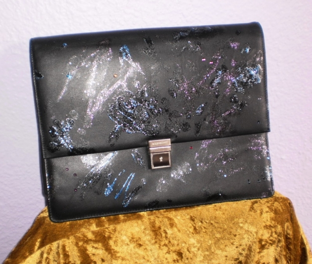 Diese Aktenmappe stellt einen weltweiten Designerschatz dar: Erstens stammt sie von der Luxusmarke Bodenschatz, zweitens wurde sie mühevoll & in Handarbeit customdesignt, also mit lila & blauer Glitzerfarbe aufgepimpt sowie mit einigen Strassteinen beklebt. Sitzt bombensicher auf dem weichen Ledermaterial. Leider erlaubt meine Kamera nicht, den satten Farbton wiederzugeben, da der Glitzer bildlich einen total verfälschten Eindruck hinterlässt & ohne Blitz alles verwackelt ist. Ich bitte dies zu entschuldigen. Man kann sich den authentischen Look in etwa wie bei einem Galaxy-Bild vorstellen, nur abstrakter.