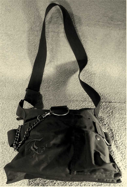 Vorne befindet sich ein Emblem und ein Karabinerhaken.