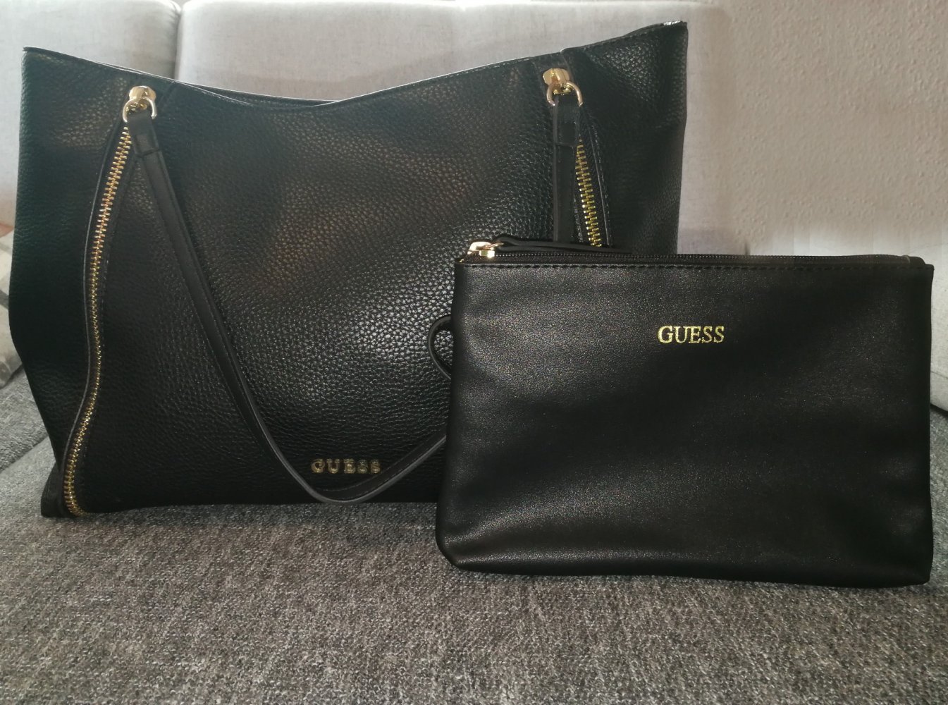 Ich biete diese Tasche von Guess an. Sie ist schwarz, hat goldene Details, ist innen gelb und besteht aus keinem echtem Leder. Zu der großen Tasche gehört eine passende kleinere Tasche dazu. Die größere Tasche hat außen am Boden zwei Makel/Absplitterungen, ansonsten ist sie in einem sehr gutem Zustand.