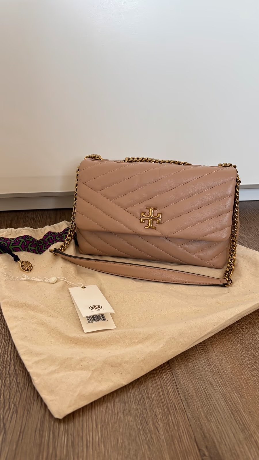 Da ich meine Handtaschen-Sammlung auflöse, trenne ich mich von meiner Kira Chevron Small in der schönen Farbe „Devon Sand" von Tory Burch. Inkl. Staubbeutel.