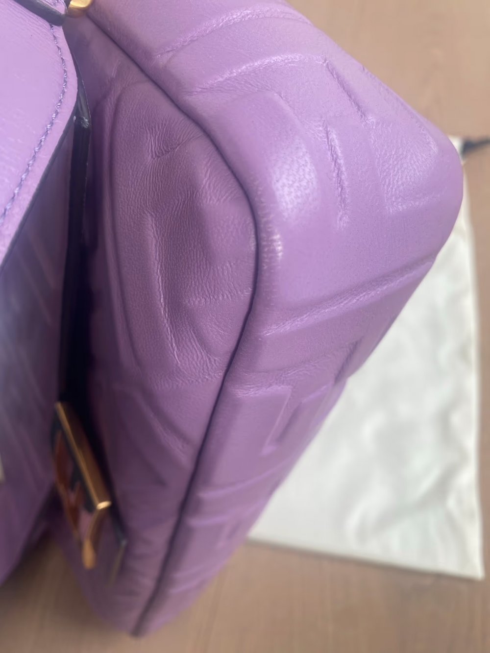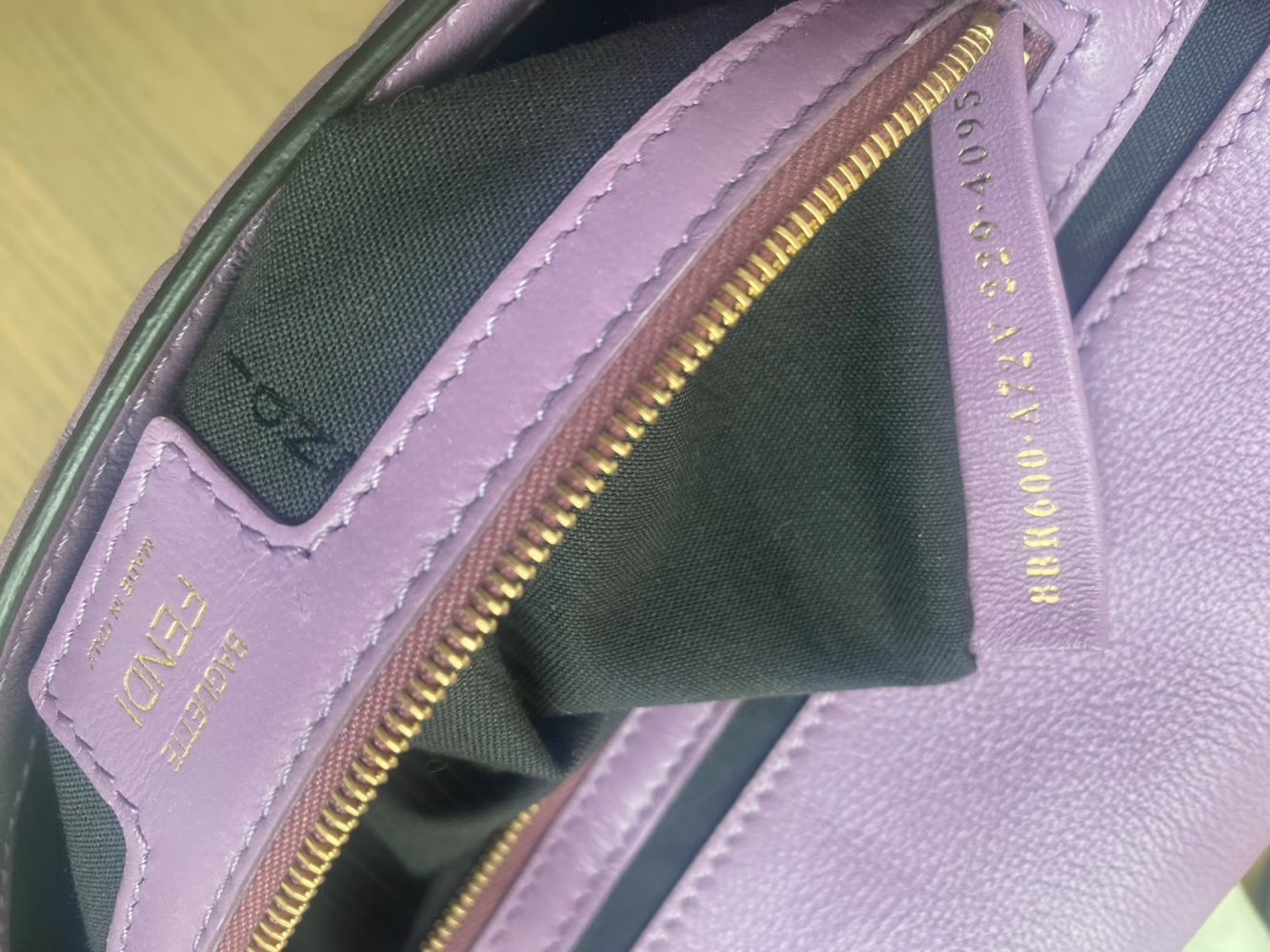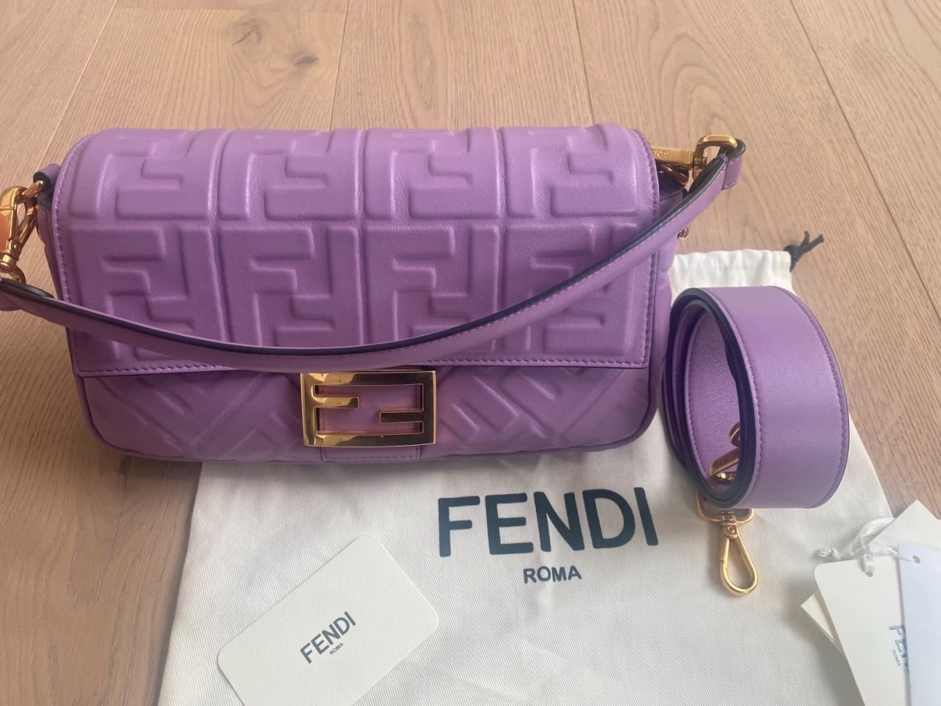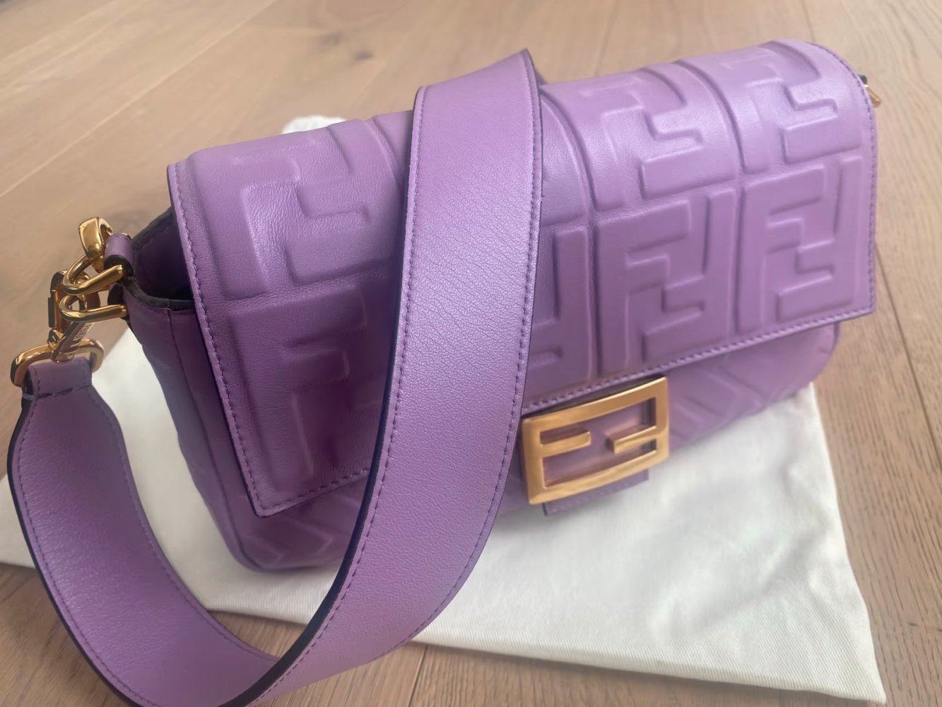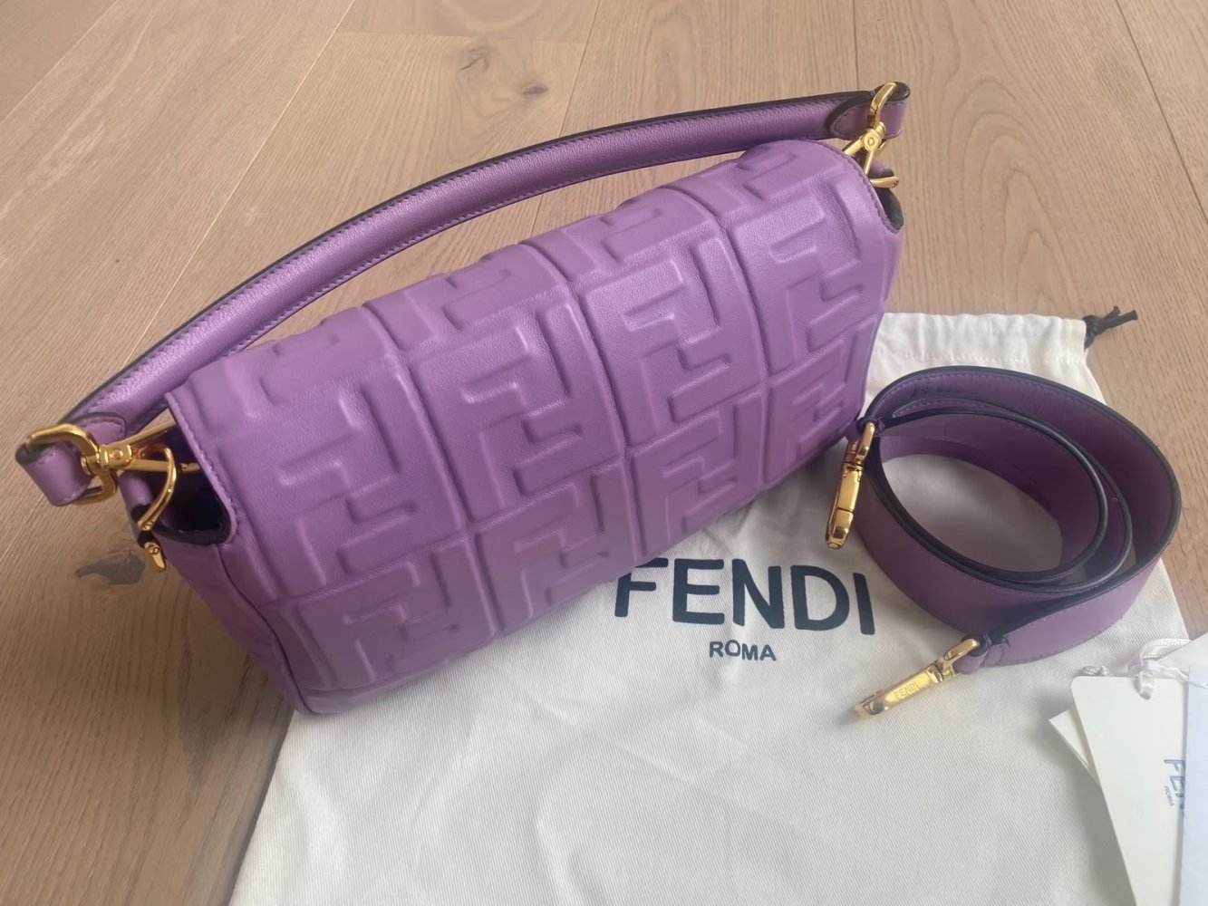 Sehr schöne FENDI Baguette Tasche aus softem Nappaleder in der Farbe Violett mit goldfarbener Hardware.