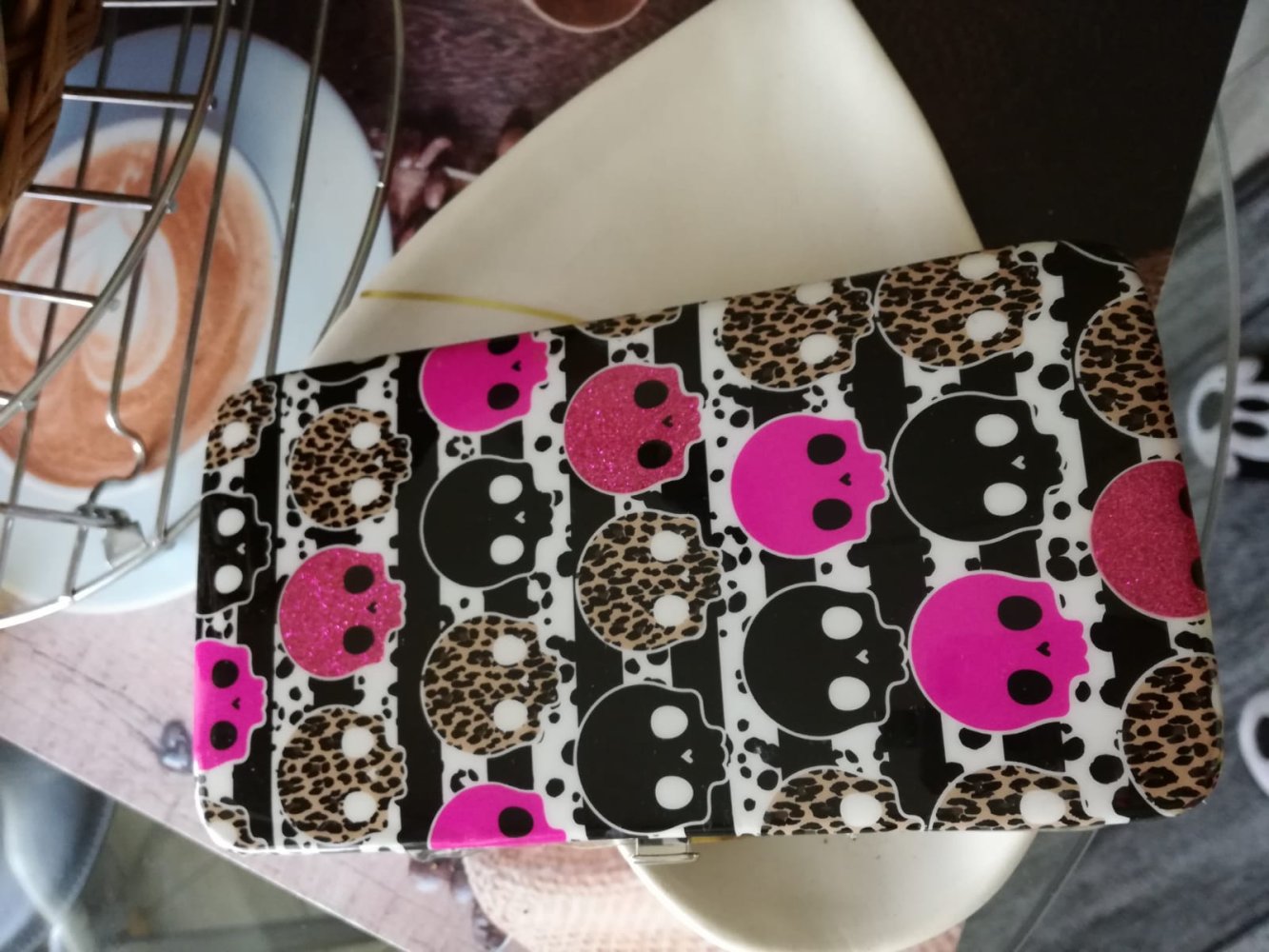 Biete diese Geldbörse mit Toten Köpfen. An der einer Seite löst sich das Material (siehe Bild). Wer ein Händchen zum Kleben besitzt, ist hier genau richtig. Hier einige Maßangaben: