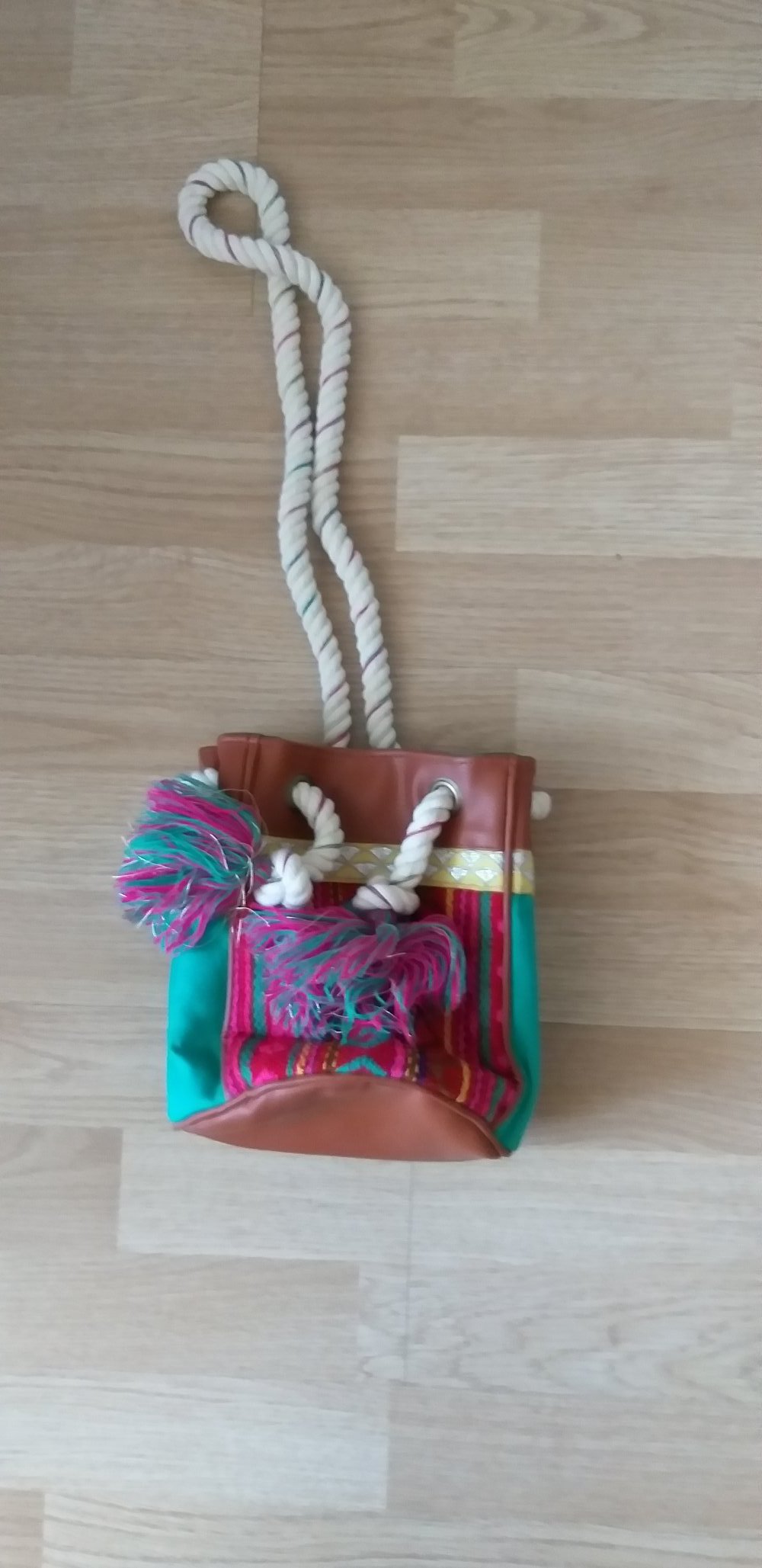 mal im Urlaub gekauft und selten benutzt - somit in Top Zustand - kleine Handtasche mit Kordelband und Druckknopfmagnet zum schließen