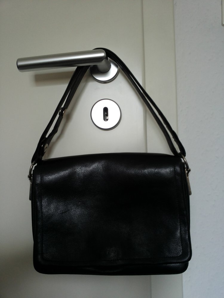 Länge des Riemens mit Druckknopf verstellbar. Somit als Handtasche (Riemen doppelt) oder Umhängetasche (Riemen einfach) zu benutzen. Um die Tasche zu öffnen, muss man das Metallteil nach unten ziehen.