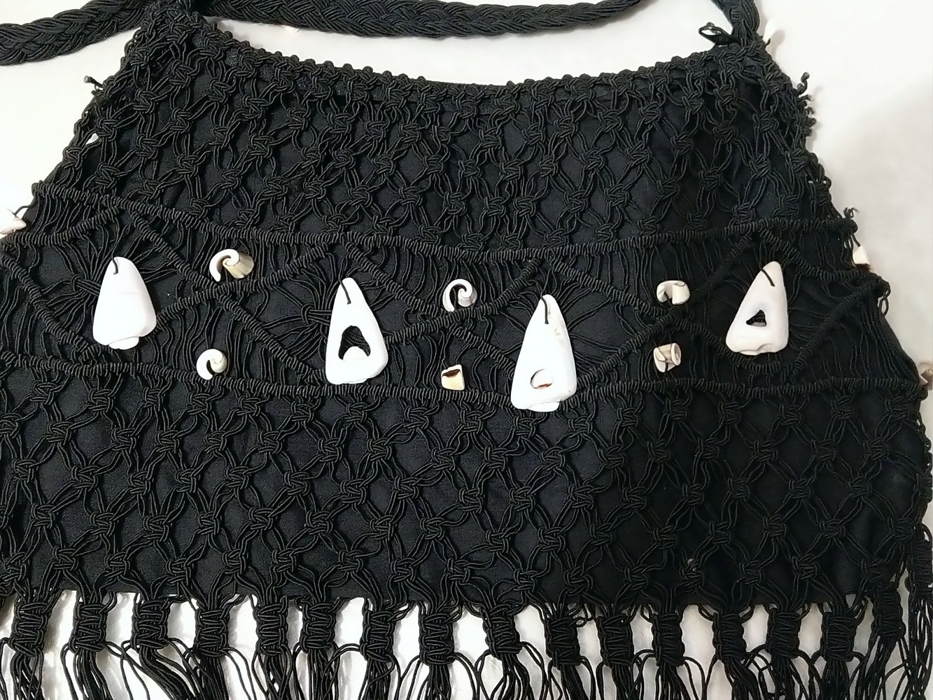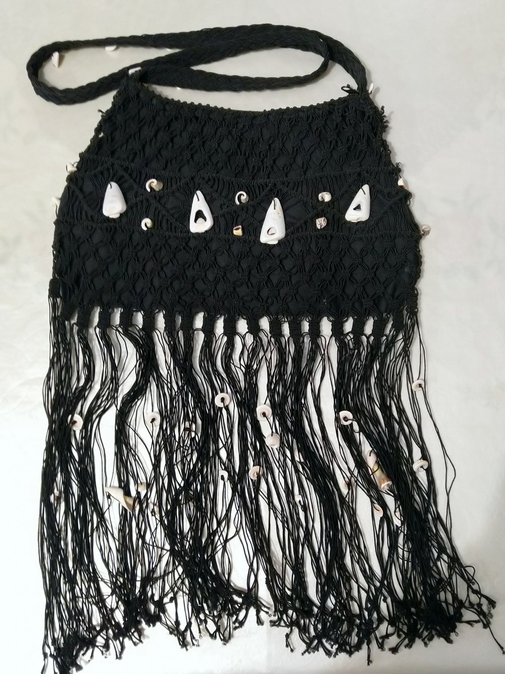 Makramee 70er Look Handtasche Umhängetasche Meeresmuschelbesatz