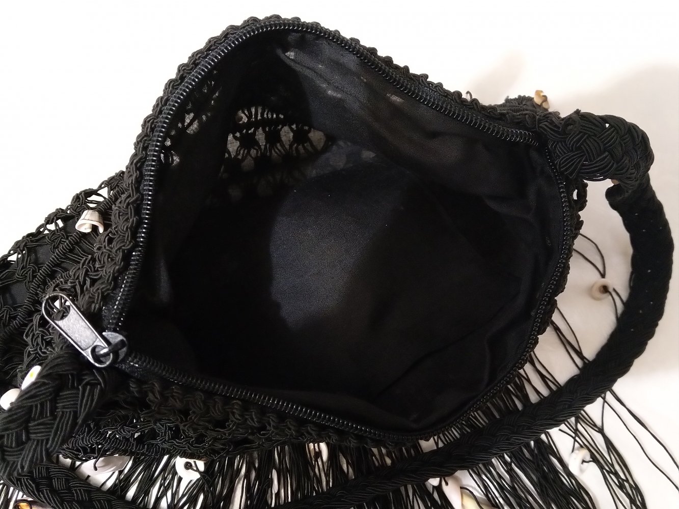 Modische Makramee Damen Handtasche, Umhängetasche im trendigen 70er-Look mit Fransen und Muschelbesatz aus echten Meeresmuscheln. Die Tasche verfügt über ein mittels Reißverschluß verschließbares geräumiges stoffgefüttertes Hauptfach und wurde einst aus dem Slovenienurlaub mitgebracht. Getragen wurde die Tasche dann von meiner Schwester noch nie. Jetzt wird für die Tasche eine neue Besitzerin und Trägerin gesucht.