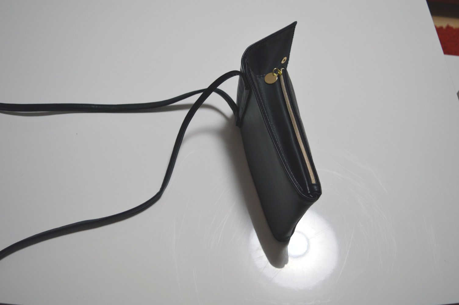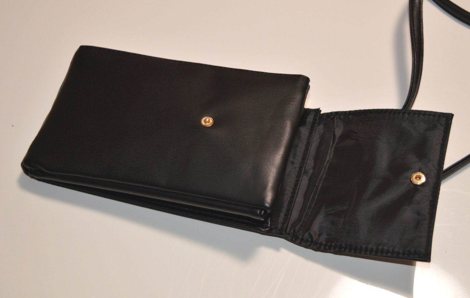 Farbe: Schwarz, Maße: Breite: ca. 11 cm, Länge ca. 20 cm, Tiefe unten ca. 2,5 cm, oben ca. 4 cm, Länge: Umhängeband ca. 120 cm, seitliche Tasche mit Reißverschluss, Druckknopf-Taschenverschluss, neuwertig, kleine Beschädigungen auf der Rückseite siehe Bild 5,