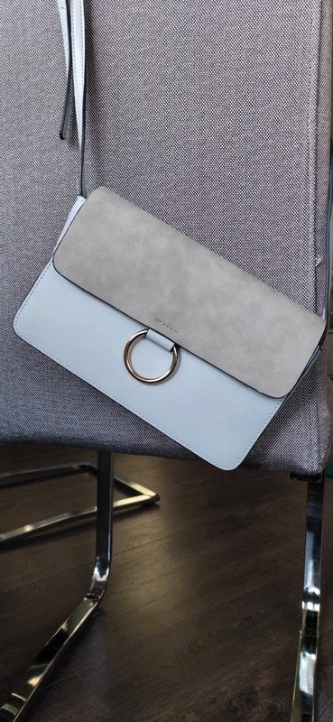 Magnetverschluss, im Hauptfach sind 2 Einsteckfächer und ein Reißverschlussfach, Träger lässt sich in der Länge verstellen, goldener Ring als Dekoelement, aus Kunstleder, hellblau: Glattlederoptik, hellgrau: Wildlederoptik, Clutch zum umhängen