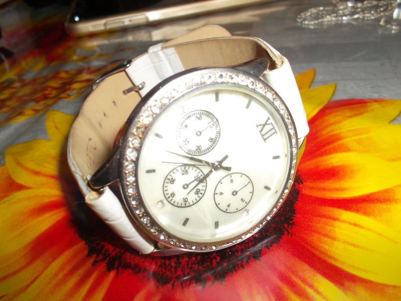 sehr schöne gut erhaltene damenarmbanduhr.weiss,verstellbar.das gehäuse aussen mit schönen steinchen verziert.es müsste nur eine neue batterie rein,und das band müsste an einer seite ein bisschen geklebt werden.ansonsten alles super.