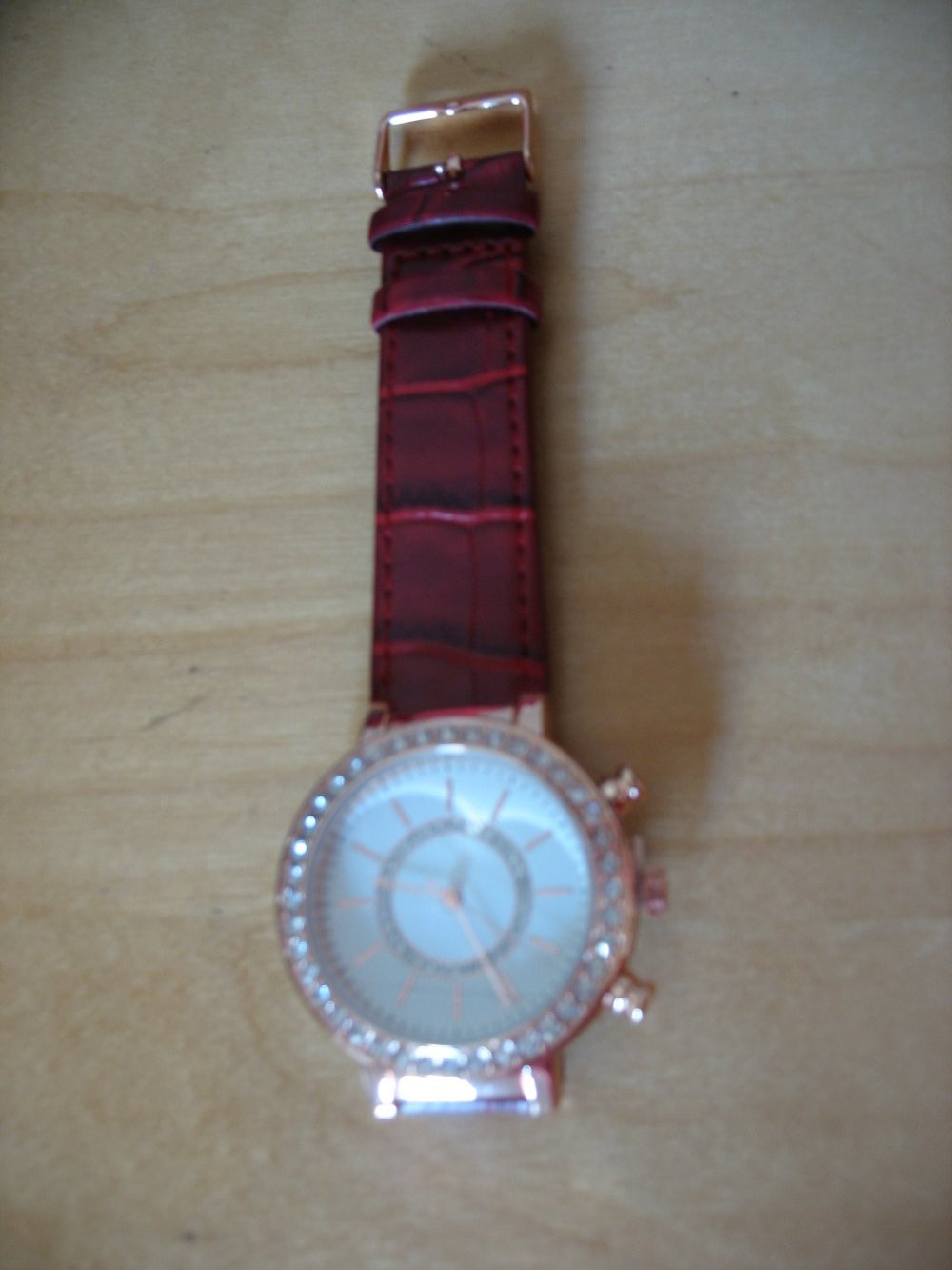 Eine Schöne Uhr mit Steinchen um da Ziffernblatt und Roten Armband.