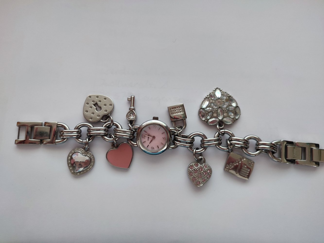Silber-rosa Fossil Bettelarmband mit Uhr.
