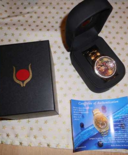 - Edelstahlgehäuse, vergoldet, von 60 weißen Swarovski- Kristallen umrandet, Durchmesser ca. 4,5 cm