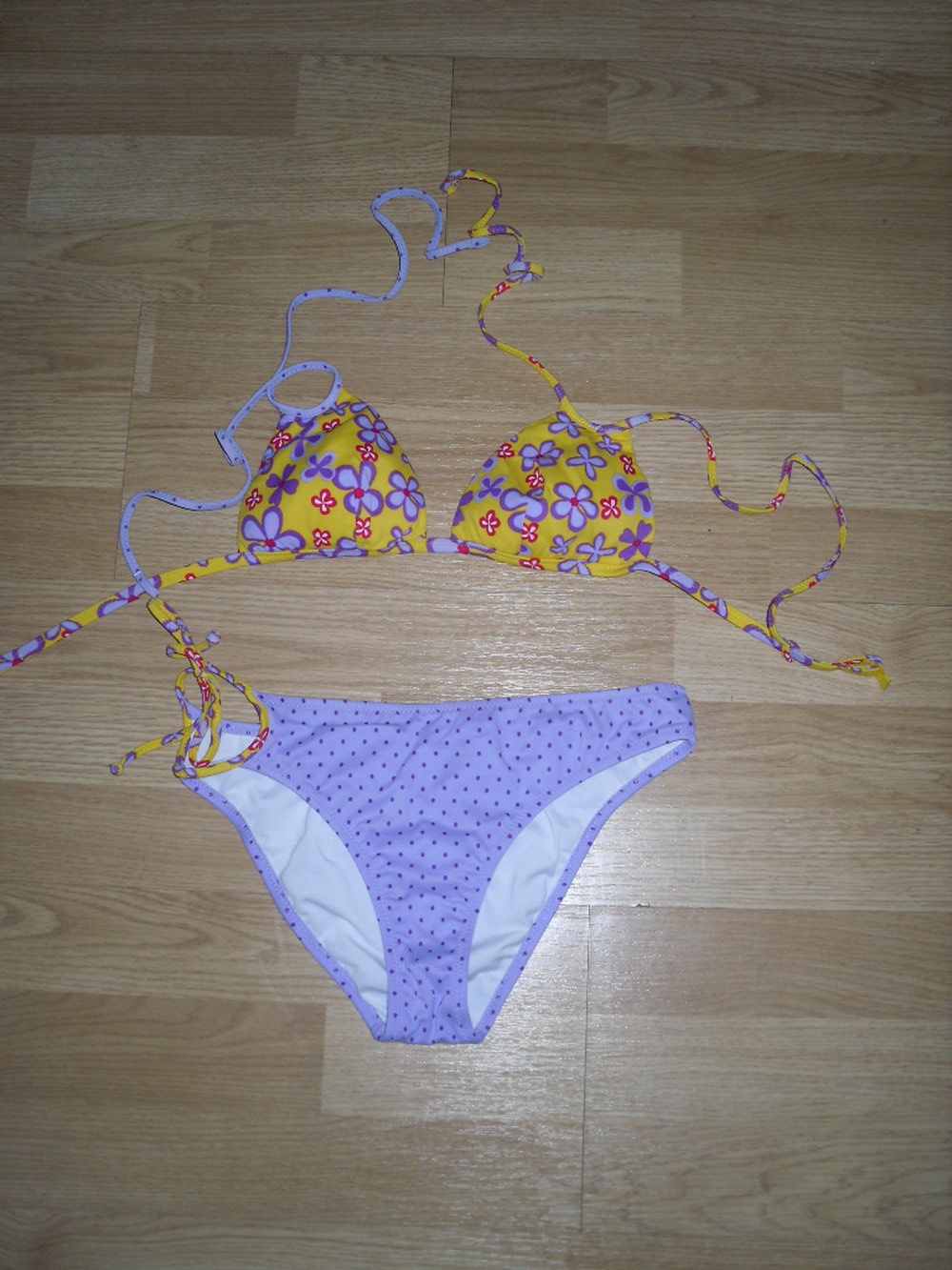 nur die Etiketten wurden von meiner Tochter abgeschnitten, ansonsten ist der Bikini echt noch super!!! das Höschen in Slipform und rechtsseitig zum binden - das Oberteil ist wattiert - mit doppelten Trägern - Plaste Einhakverschluss - ist wirklich von Calzedonia!!!!