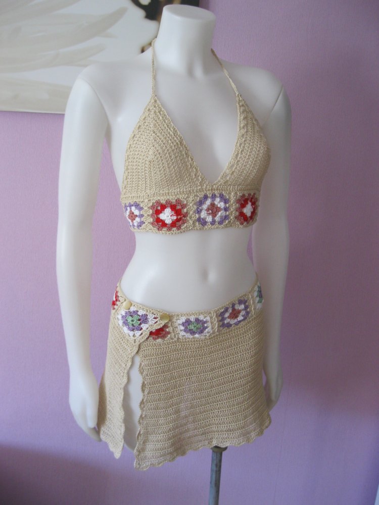2-Teiler Rock + Neckholder-Top 100% Baumwolle Cup A/B beige/bunt