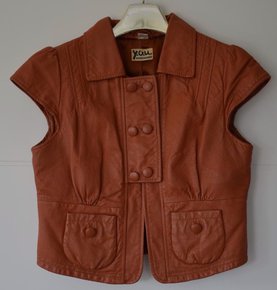 Außergewöhnliche Weste aus echtem robustem Glattleder (Schweinenappa), cognacfarben, Taillenabnäher und Teilungsnähte, Umlegekragen, Kappärmel, zum Knöpfen, vorn zwei aufgesetzte Taschen, Innen links eine Tasche mit Reißverschluss und Innen rechts zwei Taschen mit Klettverschluss, Zustand: so gut wie neu aus einem tierfreien Nichtraucher-Haushalt
