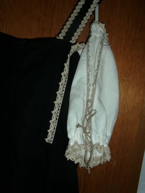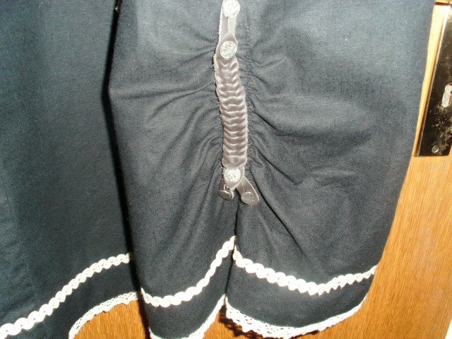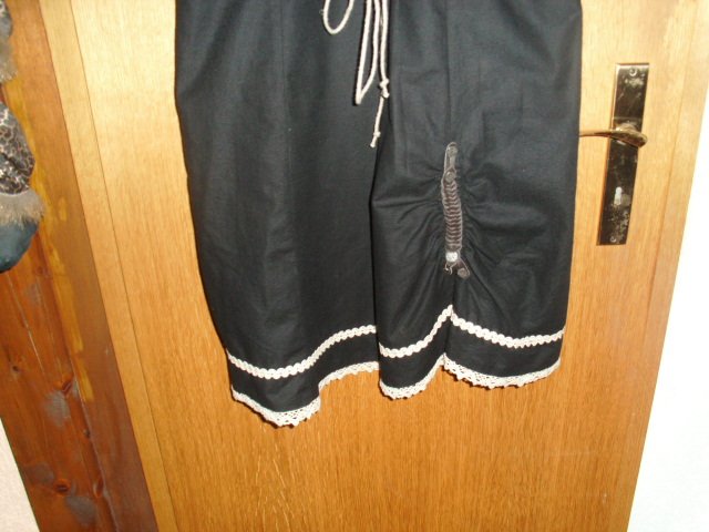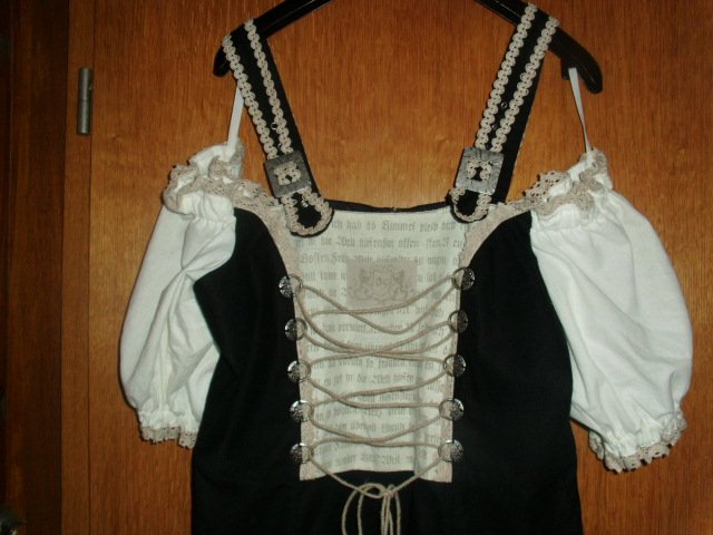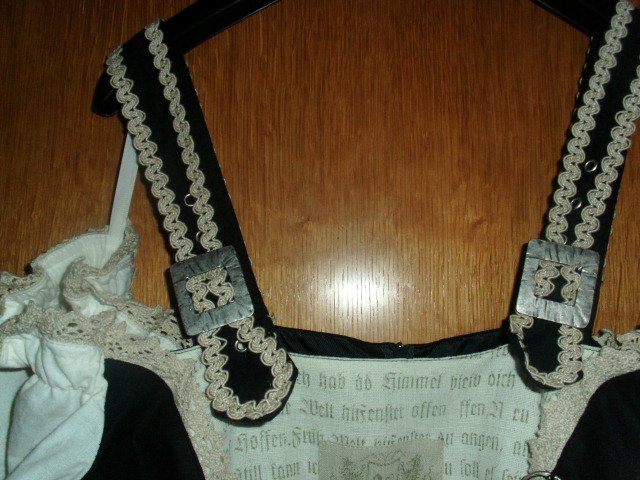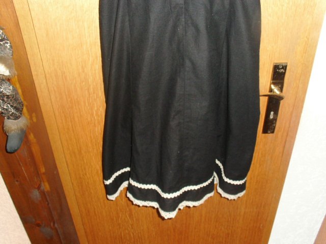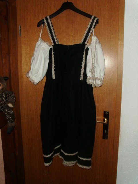 Biete hier ein Trachtenkleid von Zugspitz Trachten in Größe 42 an. Es ist zwar mit Gr. 46 angegeben, aber es fällt kleiner aus und wurde in oben genannter Größe getragen. Gebe unten noch die Maße an. Das Kleid ist schwarz und besteht aus 100% Baumwolle. Vorn befindet sich ein cremefarbiger Einsatz, welcher mit altdeutscher Schrift und einer Raffung versehen ist. Diese Raffung kann individuell der Oberweite angepasst werden. Die breiteren Träger sind größenverstellbar, sie sind mit cremefarbigen Litzen versehen und werden mit größeren eckigen silbernen Schnallen geschlossen. Die wollweißen kurzen Ärmel sind mit cremefarbigen Spitzen und einer seitlichen Schnürung versehen. Das Rockteil ist im unteren Bereich rundherum mit einer Litze und einer Spitze in creme versehen. Auf der linken unteren Rockseite befindet sich eine kleine modische Raffung mit einem Zierriegel. Das Kleid wird auf dem Rücken mit einem Reißverschluss geschlossen. Es wurde nur einmal zu einer Festlichkeit getragen und ist daher auch sehr gut erhalten.