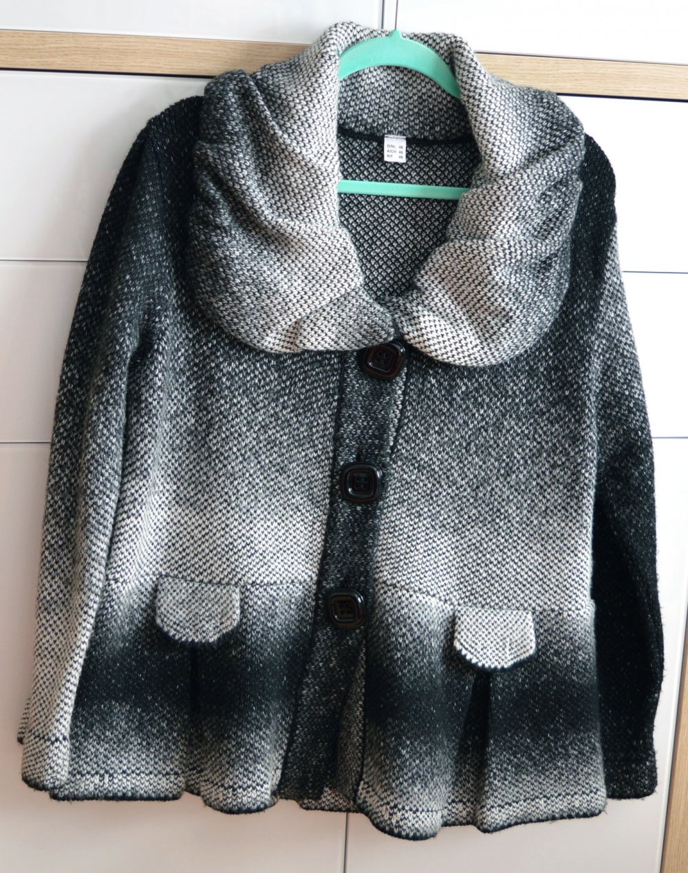 Größe 46, Farbe: schwarz-weiß, Kragenweite ca. 11-17 cm, Material: 75% Polyacryl, 25% Polyester, Vorderseite mit 3 großen Knöpfen. Links und rechts je eine angedeutete Tasche mit Faltenüberlappung, auf der Rückseite ebenfalls eine Faltenüberlappung, Schulterweite ca. 55 cm, Armlänge ca. 49 cm, Achsel zu Achsel ca. 62 cm, Lange: ca. 69 cm, Umfang unten ca. 139 cm,