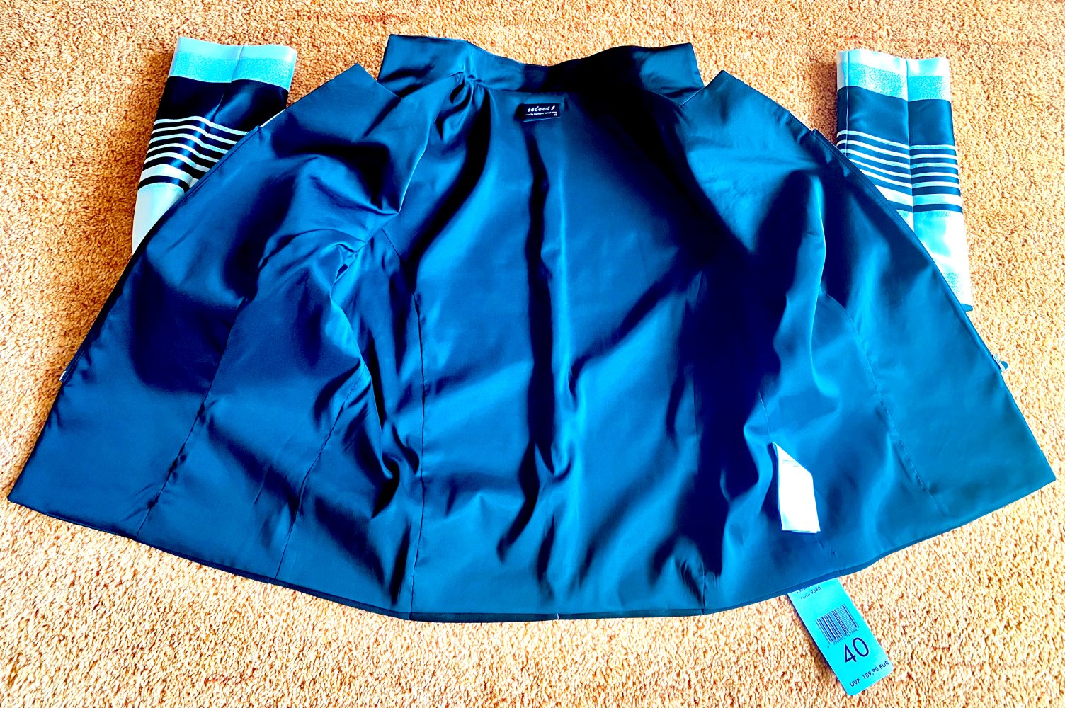 Besonderheiten: Taillierte Form, mit Schulterpolstern, komplett gefüttert, vorne spitz zulaufend, Reißverschluss