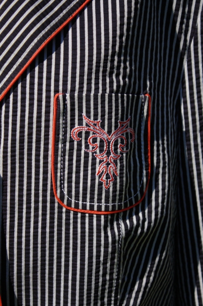 Die Jacke ist leicht tailliert und hat drei Taschen, wovon eine (Brusttasche) mit einem rot-weissen Stickmotiv verziert ist (siehe Detailfoto).