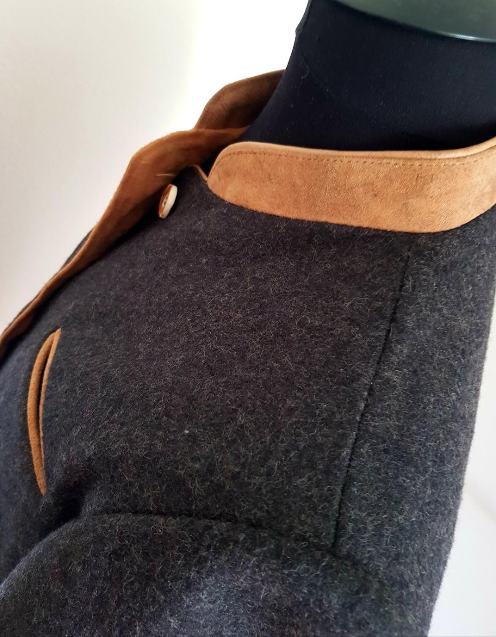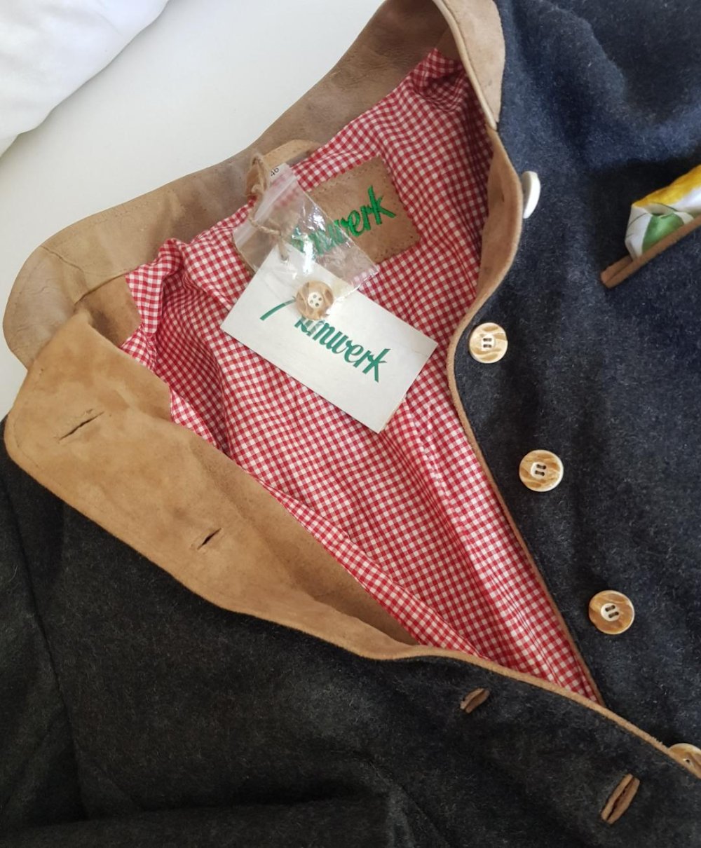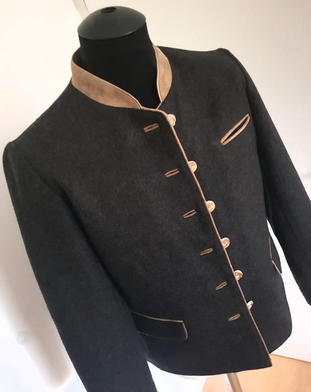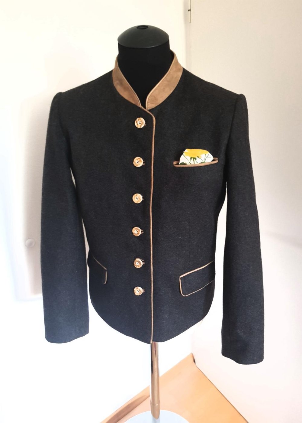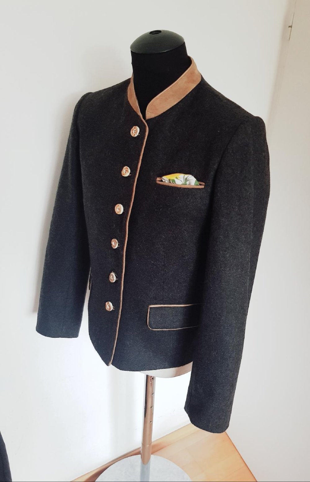 Die Trachtenjacke ist dunkelgrau mit 80% Wolle geschneidert, und ringsum mit hellen/beige echt Leder abgesetzt.