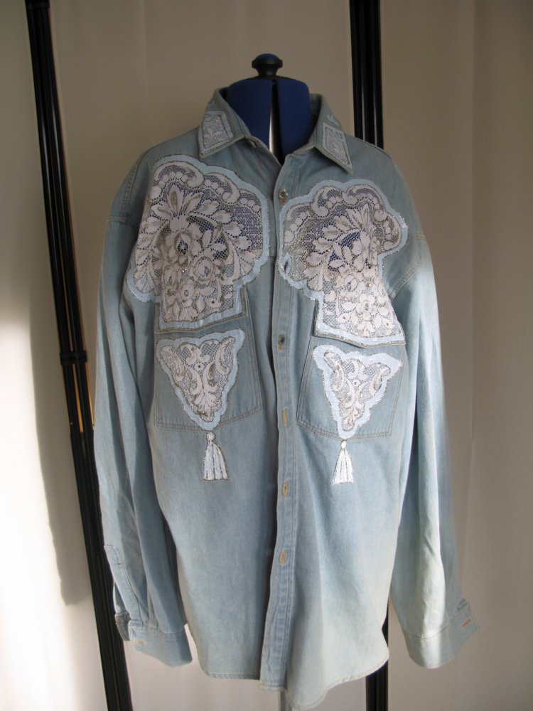 Extravagantes langes Jeanshemd für besondere Anlässe, mit durchsichtiger weißer Spitze vorne und hinten, Strasssteine.