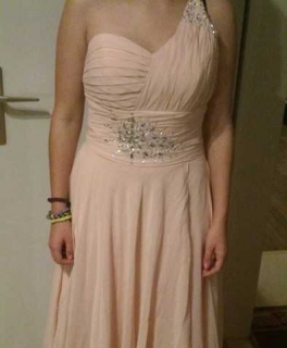 Wunderschönes neues One-Shoulder-Kleid im A-Schnitt. Es ist bodenlang und aus feinem Chiffon und Perlen/Pailetten verziert. Der Träger ist komplett mit Perlen/Pailetten verziert. Hinten ist ein Reißverschluss.